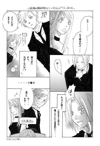 新年最初のペーパーです。裏っ側には礼のマフィア小説も載ってました。 いかに我々が例のイラストに萌えたかよく判るペーパー(笑) アルのとこは「見たまんまで負け」ウィンとこは「もはやウィンリィにすら危ういカンジ」って書いてます。