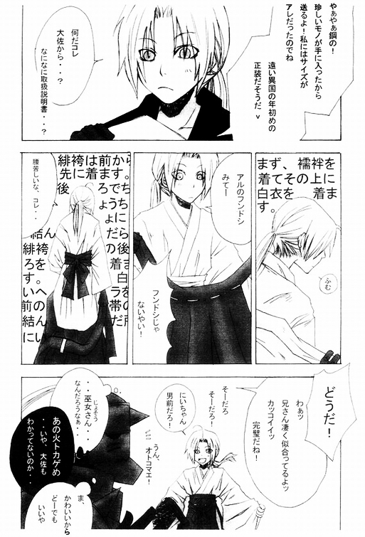 冬のペーパー発見しました・・・・!(一年後の大掃除で え)兄さんは緋袴似合いそうですよね。 袴の正式なのはマチのあるタイプですが、最近は略式の行灯袴というスカート状のものも多いそう。つまり最近では女性用の袴はスカートのもんがほとんどってことですね・・・・。